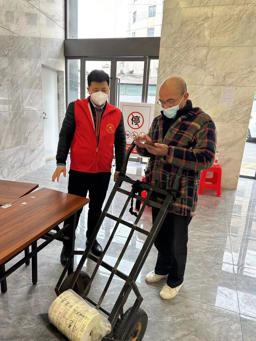 ? ? ? ?永寧社區第一大道翡翠座小區里,碧水集團下沉黨員幫助群眾跑腿買物資、倒垃圾、遞送生活用品。為保障轄區居民生活物資需求,下沉黨員和社區網格員攜手24小時在線值守幫辦,尤其對不會“網購”的老年人群體在生活物資采購、跑腿買藥等方面的需求,隨時“接單”,及時“送貨上門”。小區居民感謝地說到:“謝謝你們,買油買米,又送藥上門,天氣冷,你們也要注意保暖啊。”下沉黨員黃茜說:“居民的關懷和感謝,讓我們倍感溫暖。”