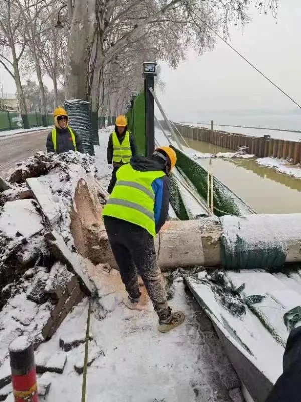 ? ? ? ?2月4日04時10分,武漢市氣象臺發布暴雪黃色預警信號。東湖綠道三期項目位于東湖南路,雙向兩車道,毗鄰東湖,道路臨水、彎多、路窄,一旦結冰行車時危險性極高。清晨6點半不到,項目部突擊隊員們在武漢大學凌波門集合,投入到緊張的鏟雪除冰行動。經過近6個小時的與雪“共舞”,東湖南路凌波門附近積雪和厚冰被突擊隊一掃而凈。截至5日下午15時,為放鷹臺段人行通道420米、東湖南路3公里掃雪除冰,清理倒伏法桐一棵、沿線因雪壓落樹枝全部清理完畢,道路無結冰且通行狀態良好。