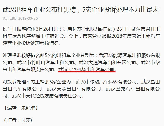 ? ?據長江日報融媒體3月26日訊,機總公司所屬武漢天河機場出租汽車公司在武漢市召開出租車運營秩序整治工作推進會上,被市客管處評為2018年度客運出租汽車經營企業處理投訴較好的紅榜企業。
