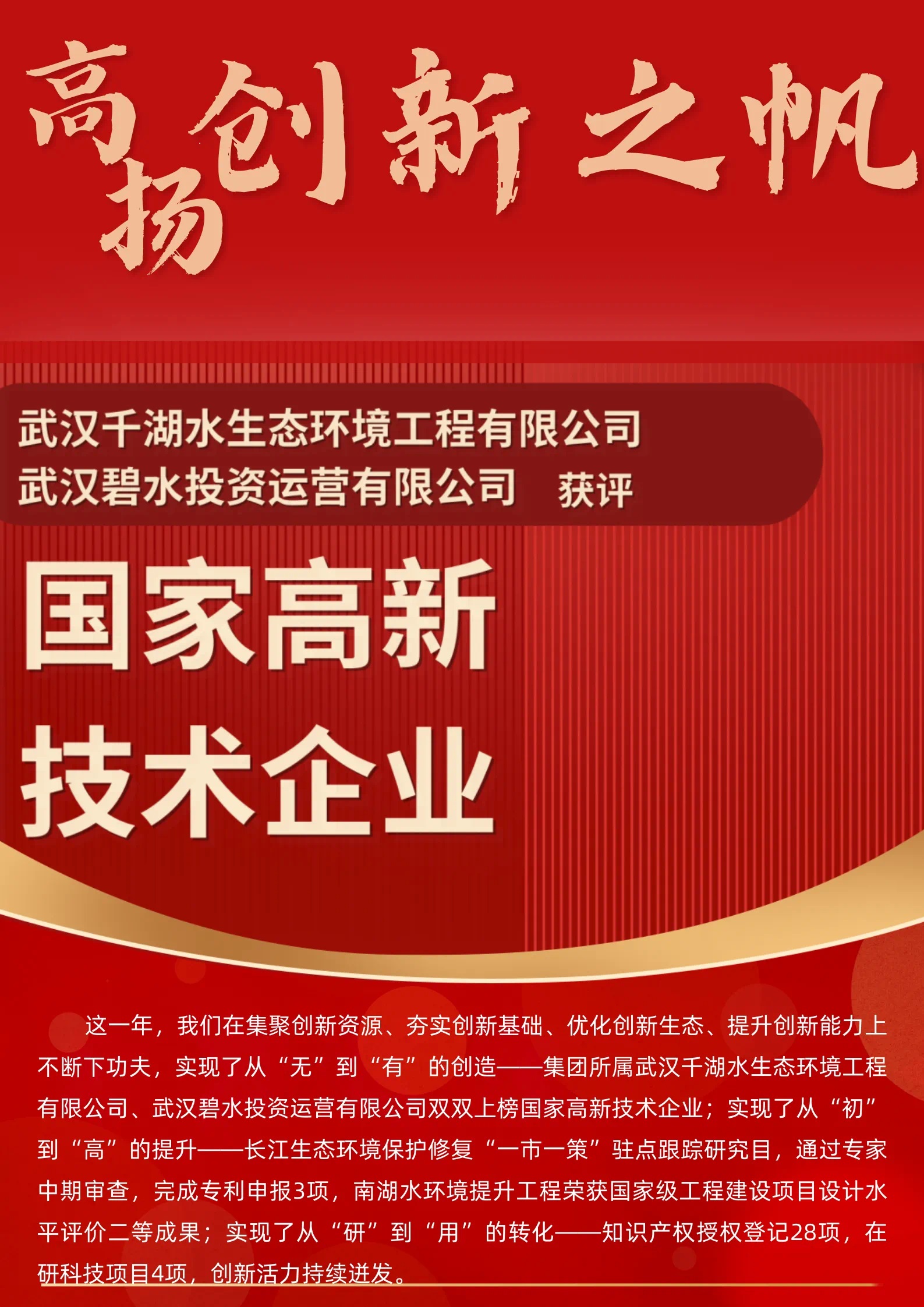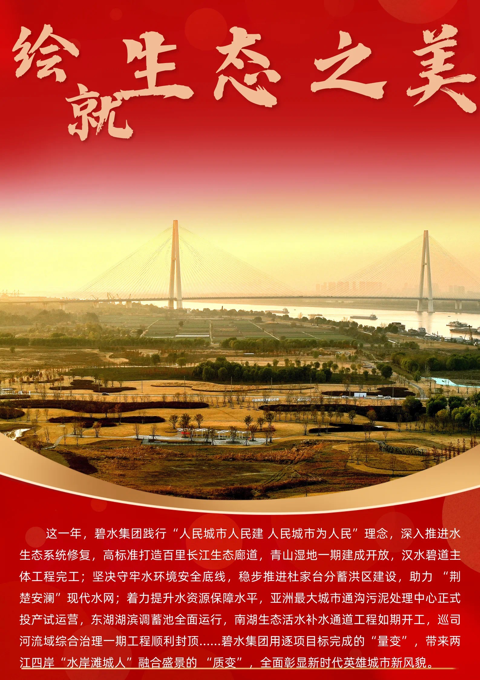 ? ? ? ?2023年,碧水集團堅持以習近平新時代中國特色社會主義思想為指導,以全面學習貫徹黨的二十大精神開局啟航,在武漢城發集團領導下,錨定轉型發展首要任務,圍繞“抓項目、保投資、謀發展、促改革、防風險”工作主基調,保持向上向好的發展態勢,交出一份“難中有為、干中有成、穩中有進”的轉型發展新答卷。
